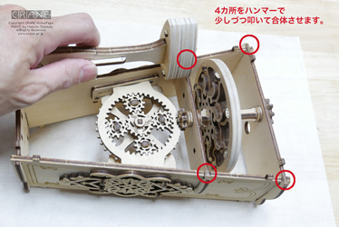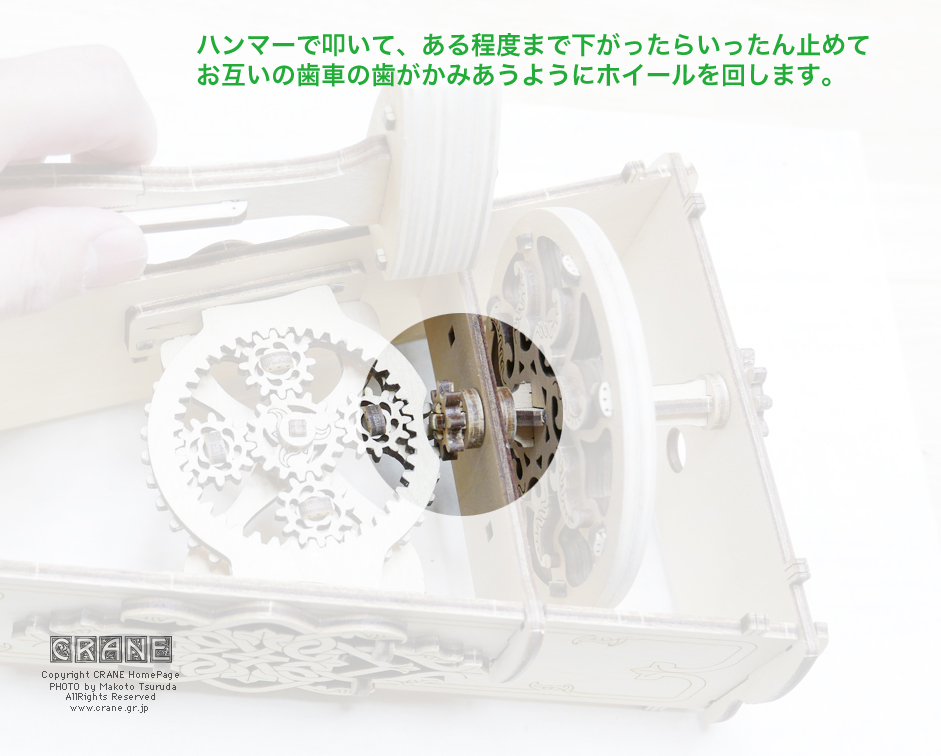 演出歯車の一部分とホイールの歯車の一部がかみ合う必要があるので、一気に押し込もうとするとこの接続部を壊しかねません。徐々に作業しながら途中でいったん叩くのをやめて、ホイールをちょっと回転させて歯車同士が問題無くかみあうようにするのがコツです。