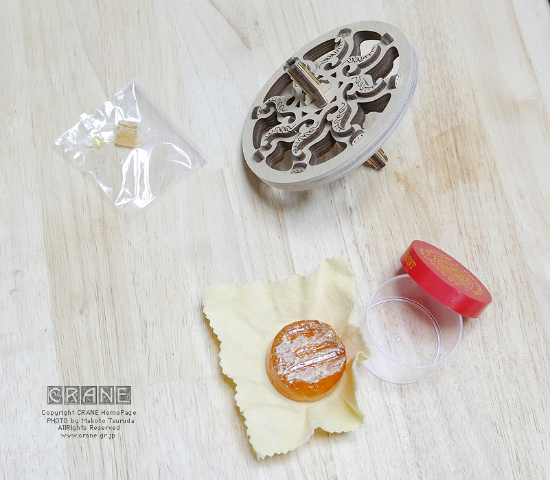 付属の松ヤニは 1cm 程度のサイコロ状。これをゴシゴシとホイール面にこすりつけるだけです。