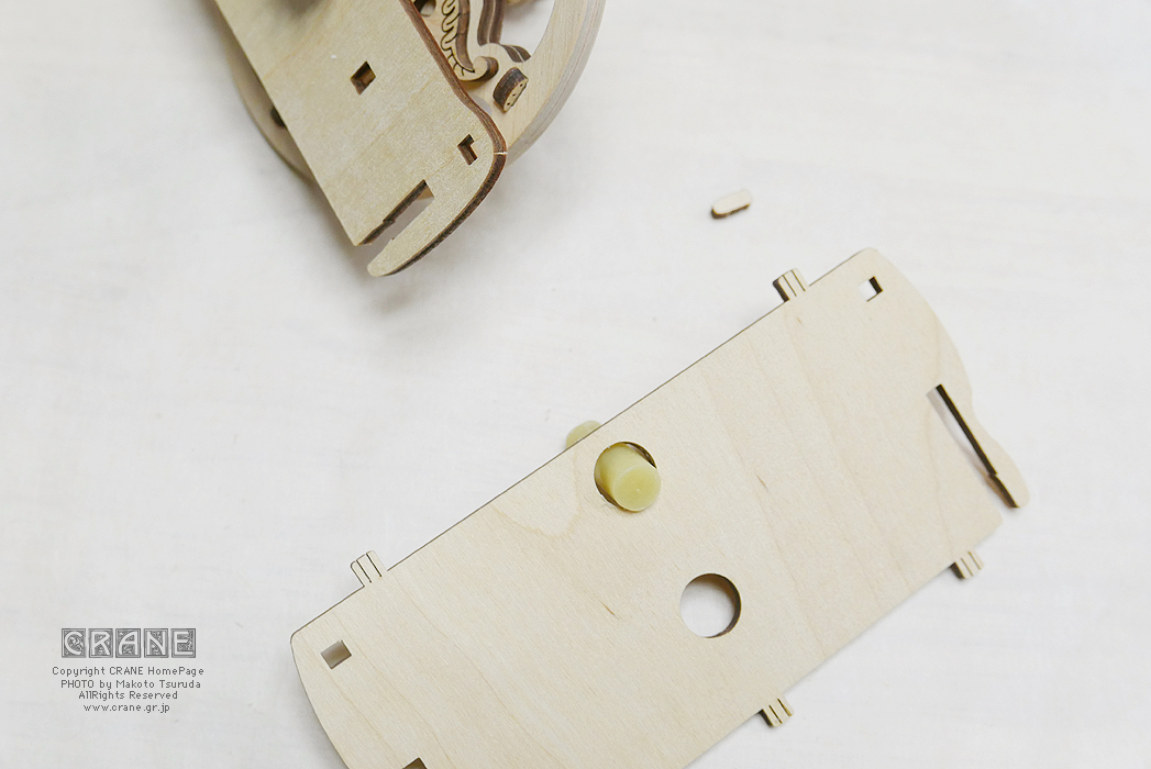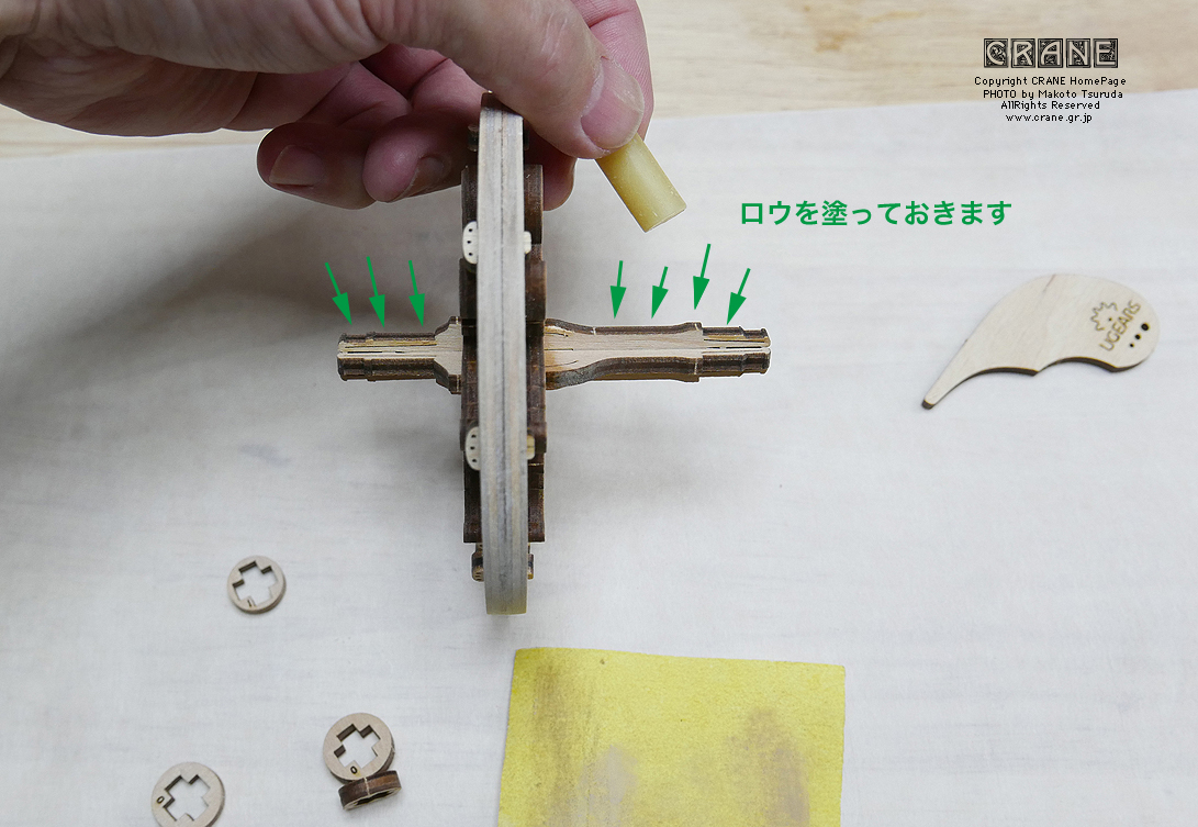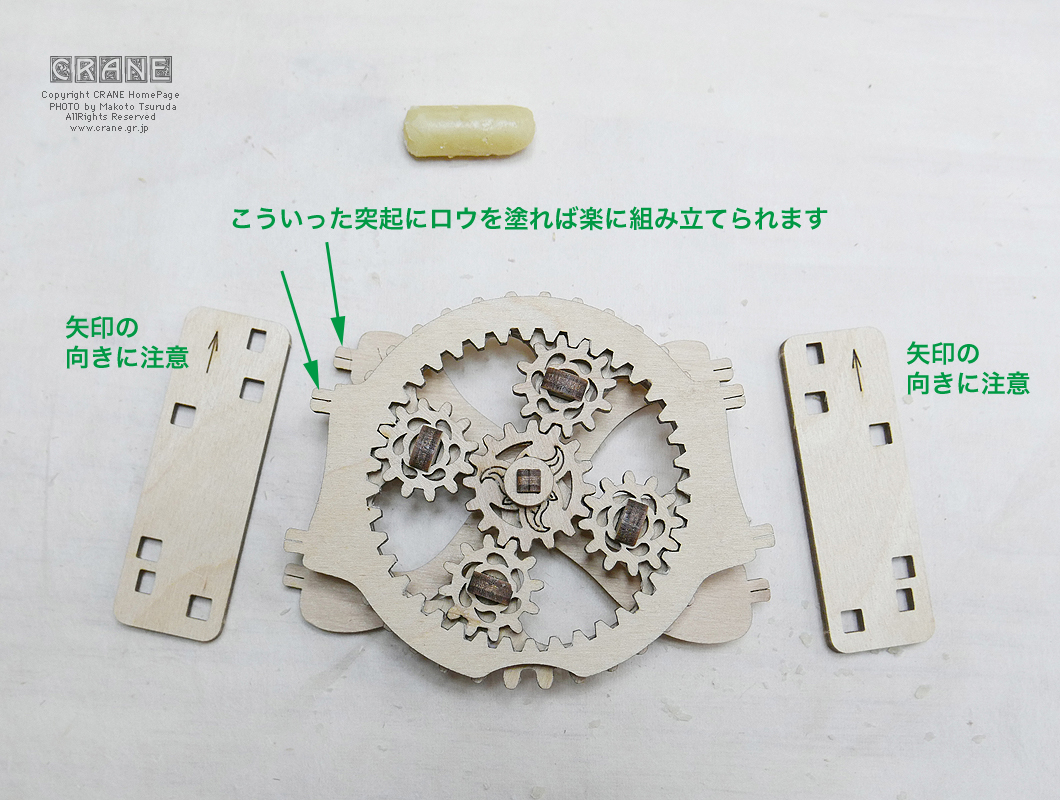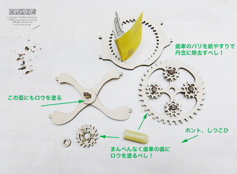 ● 歯車(ギア)には入念にロウを塗るべきです。今後も歯車部品がたくさん登場します。私も必ずしも毎回指摘しないかもしれませんので、決して手抜きをせずにロウを塗ってください。今後もとにかく歯車を見たらロウを! 完成後に摩擦音が大きかったり、かんだり、といった複数の問題を防止するためです。