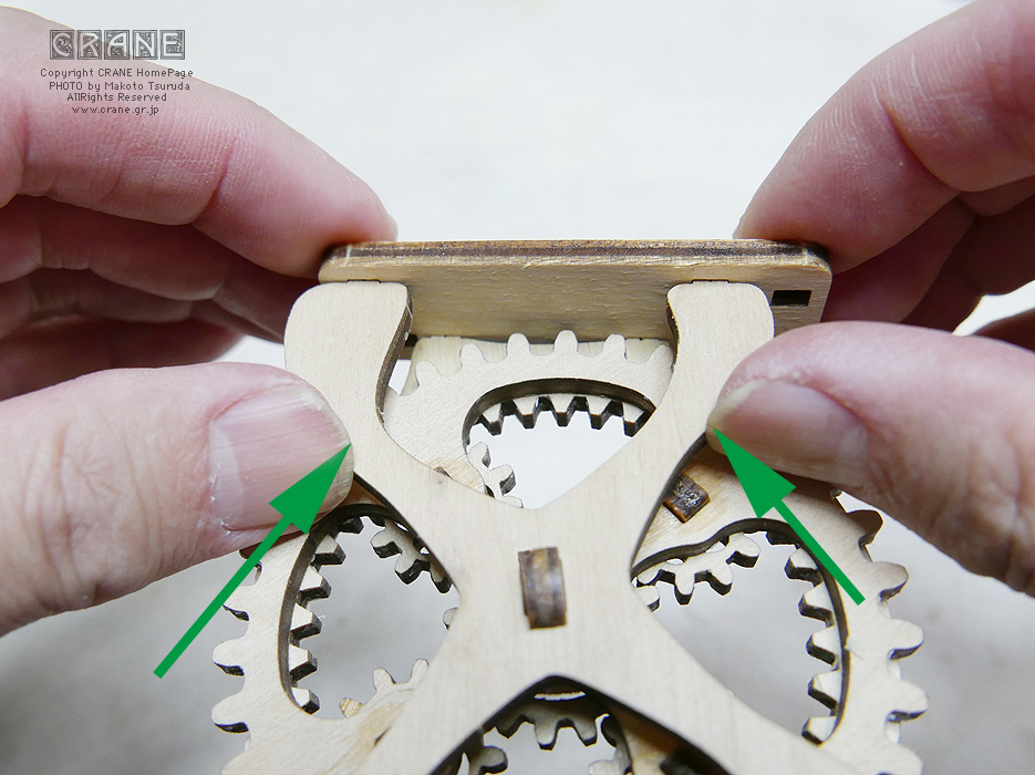 さきほどの演出歯車の両脇に2枚の固定板を付けます(矢印が刻印されているので向きに注意)。