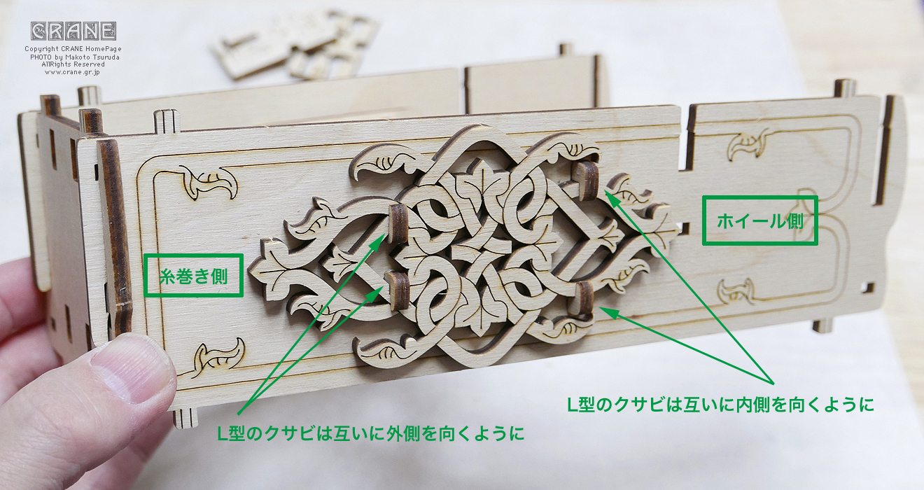 (1)糸巻側:L型のクサビは26番(長い)と27番(短い)をペアで外側に向くように挿します。