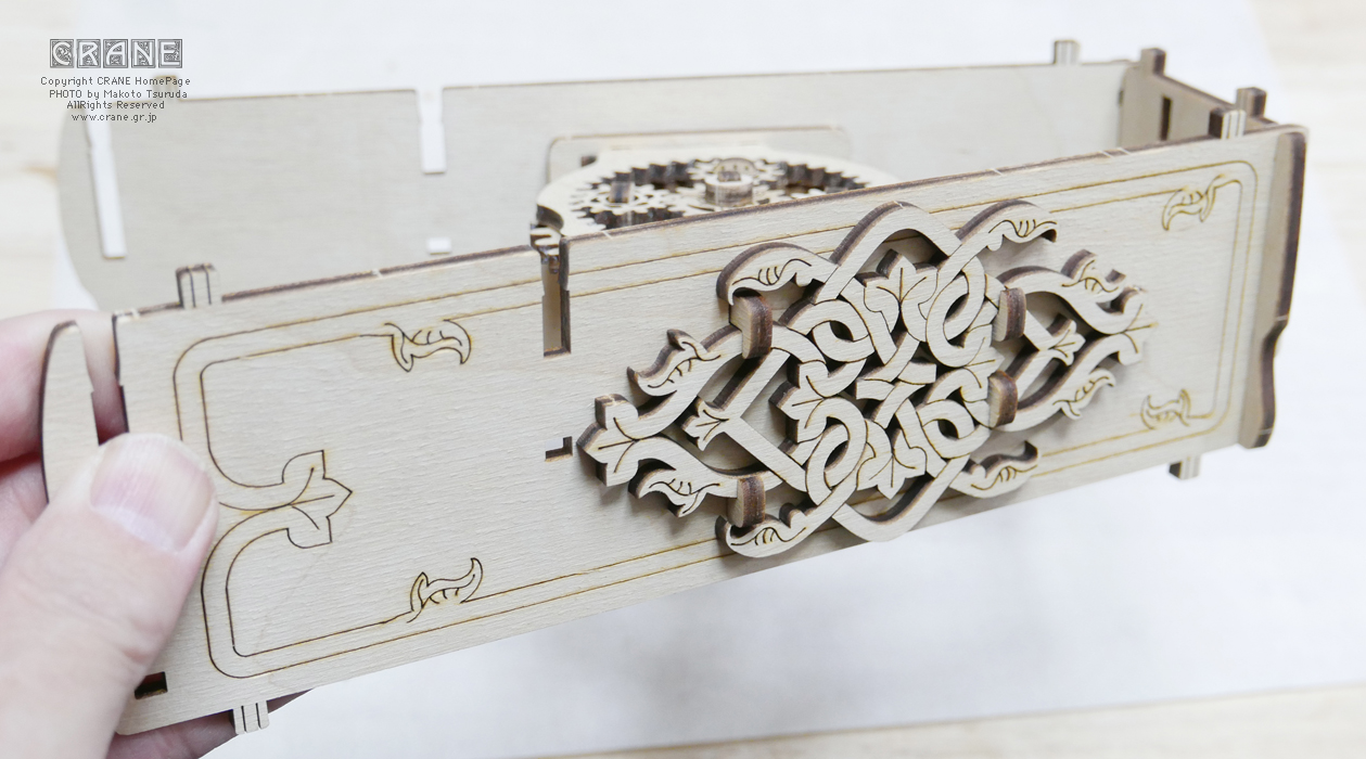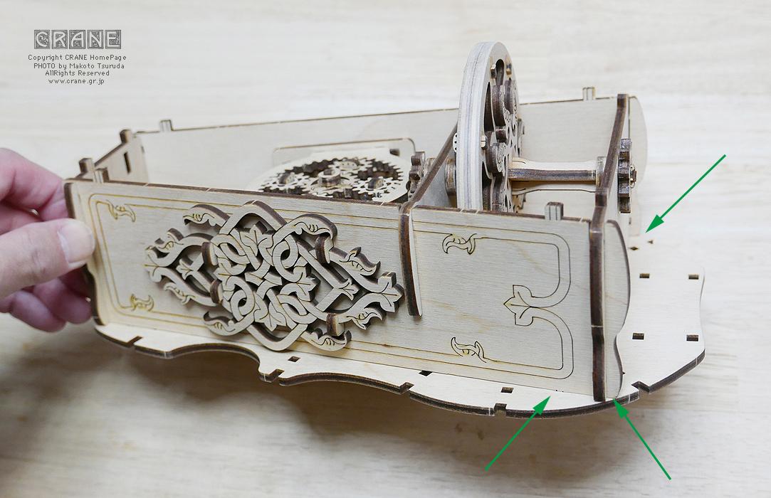 (3)ボディパネルには装飾板(唐草文様)を貼り、それを固定するピン(クサビ)の一部を使って演出歯車ユニットを固定するという構造です。