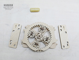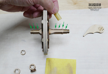 (4)今度は長い軸側です。部品板1番から 11番 の歯車(ギア)を取り出しロウを塗ったのち 29番 パネル部品と共にホイールの長い軸側に挿しておきます。