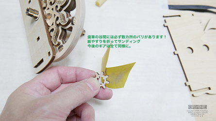 ● 歯車の谷間には部品板から取り出したときのバリが付いているので、折った紙やすりできれいにしましょう。今後は歯車を見たら谷間のバリを忘れずに!