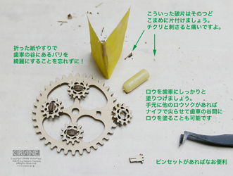しつこいようですが、歯車の歯のひとつひとつにロウを塗ってください。根気がいります。