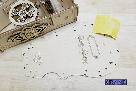 (1)まずボディ両脇の部品(22番)を取り出したら、バリをサンディングしてならします(レーザー切り出し面に10か所ぐらいバリがあります)。23番も同様にバリをとります。