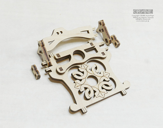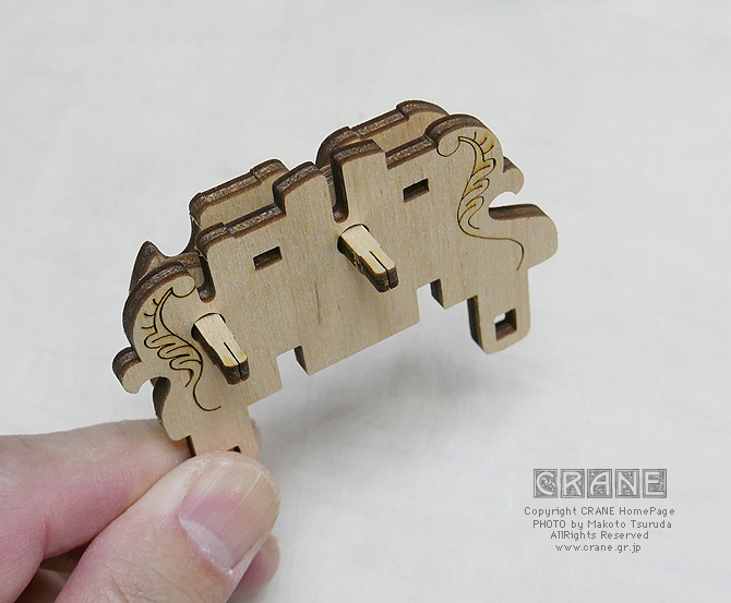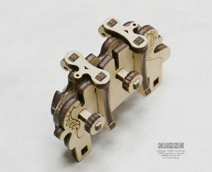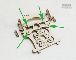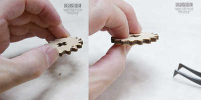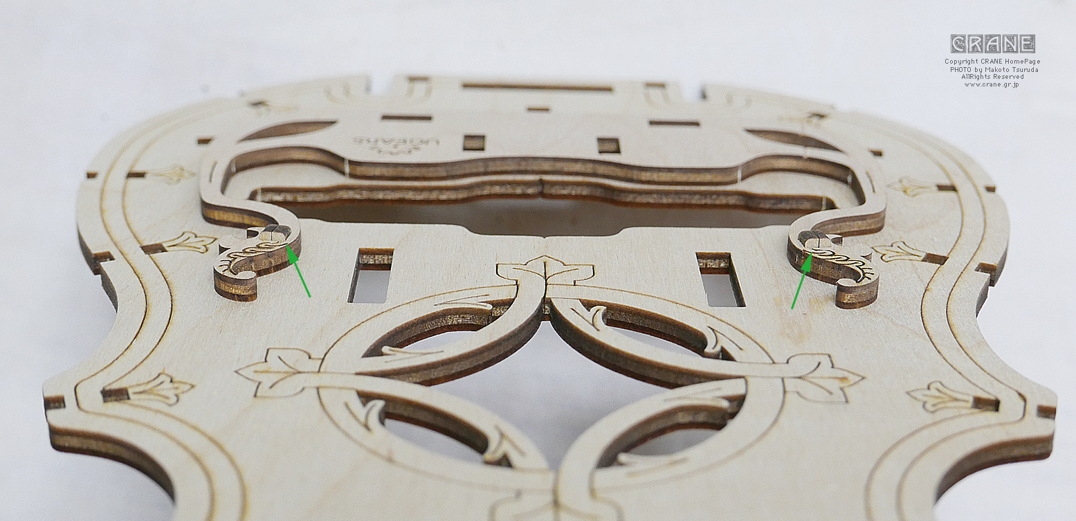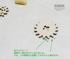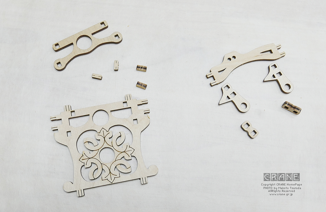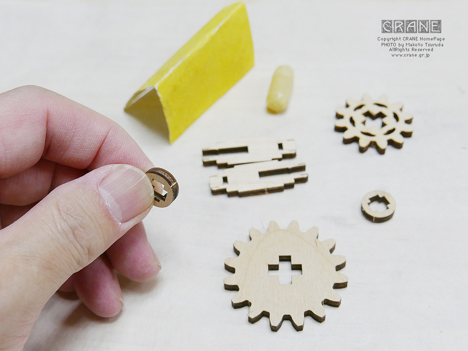 【注意】丸い軸受部品に + の穴が開いた部品がよく登場します(薩摩藩パーツ、もしくは赤十字パーツですな)。これらはレーザーで正確にカットされているのですが、木材の収縮とレーザー熱等でわずかな変形があります。そのため、いったん十字の軸に入れようとしてキツイ場合は無理に入れると割れます(ロウを塗っても割れることがある)。そんなときはいったん抜いて90度または180度向きを変えて挿してみましょう。