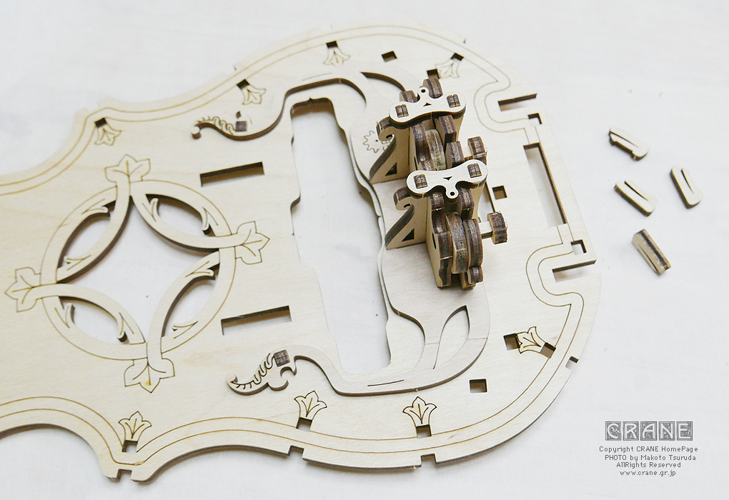 下の歯車を挿しておき、テールピースユニットの足を傾けて裏板にそこそこ挿します。