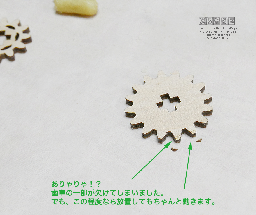 ● このキットのシナ合板はウクライナやチェコあたりで環境に配慮して作られているのですが、レーザーカットとはいえ元は天然の木材。それで、私たちが組み立てている最中に欠けることがあります。ただ、原則どの部品も欠けてもそのまま使えるように考えて設計してあります(このへんがスゴイところ