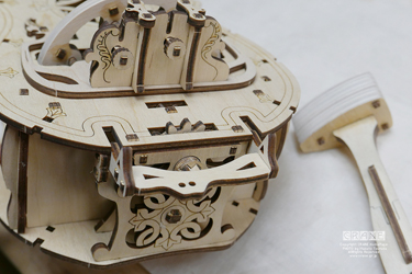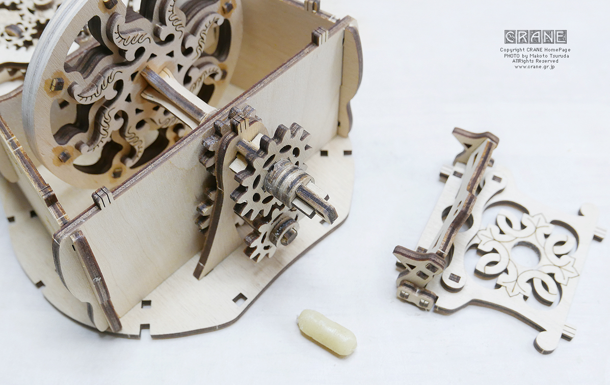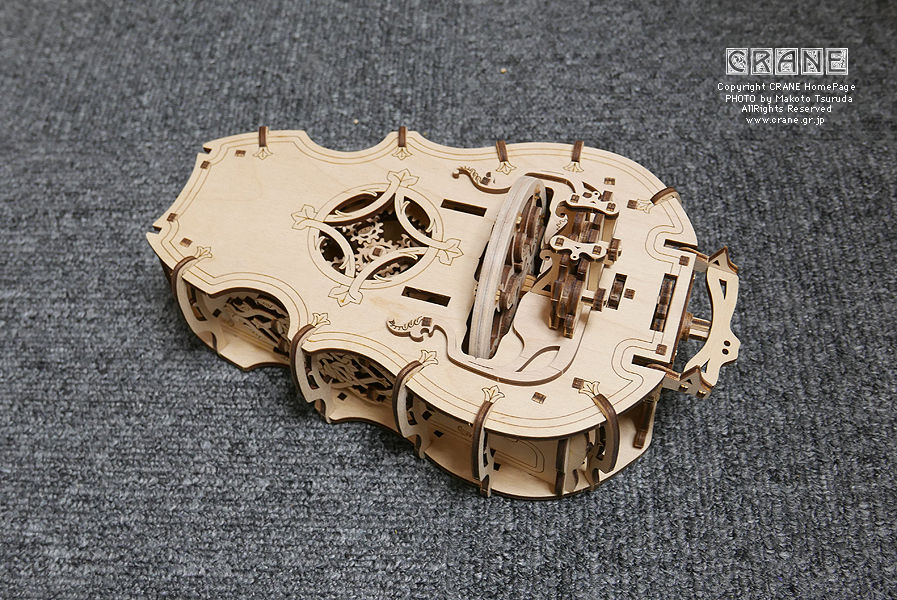 ● 一般的なハーディガーディのハンドルは軸の延長にホイールが付いているのでハンドルとホイールの回転は同じですが、このキットでは変速ギアを内蔵しており、ハンドルを1回転するとホイールは2回転します。二倍!二倍!(←高見山親方風に)