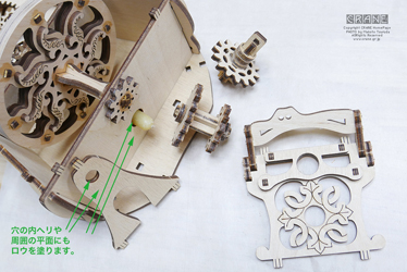(3)あとは図にならって組み立てますが、最後に上下2つの穴の周辺にロウを塗ります(歯車の面がこの面に接するため)。