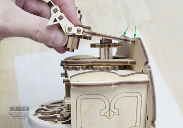 上の歯車はテールピースユニットの穴に挿して手で落ちないようにしながら組み上げます。皆さんも工夫してみてください。