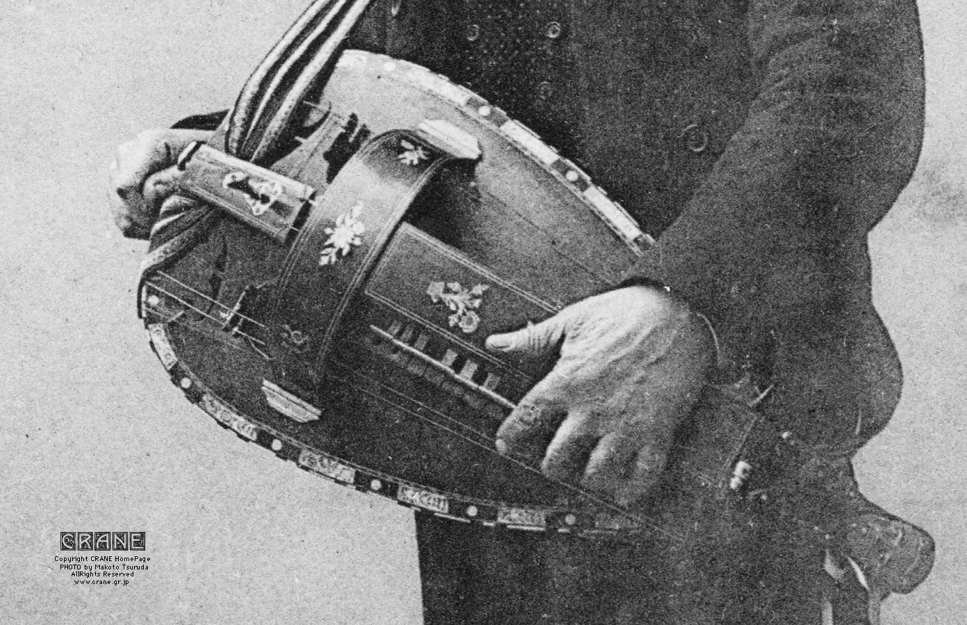 楽器の拡大画像も掲載しておきます。ペグボックスのペグの数と写っている弦を数えたところ、6弦と思われます。メロディーに2本、トランペット / 犬駒に1本、ショートドローンが2本、ロングドローンが1本、といったところでしょうか。7本にも見えなくもないです。ボウルバック(リュート風)のボディで表面板の周囲にはMOP / 真珠母貝 のパーフリングが施されており、各部に象牙らしきパーツも見られます。ストラップの使い方にもご注目。