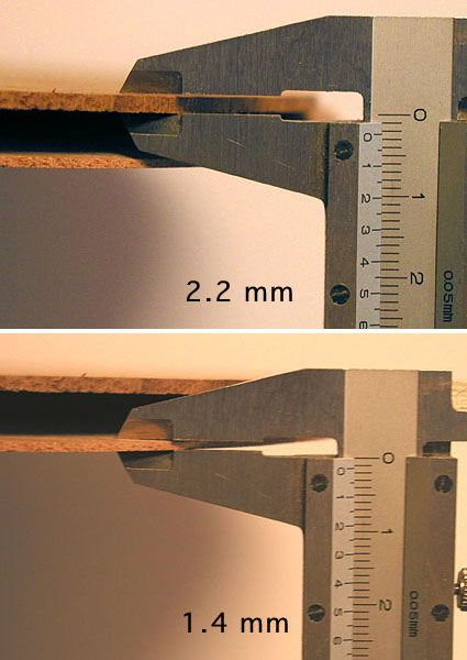 表面板の厚さは古来より様々なものがあるわけでして、薄いものは1mm程度、厚いもので3mm なんてのも見たことがあります。問題は薄くすれば必ずしも「良い音で鳴る」というわけでは無いということでありまして、弦楽器全般でいえることですがボデイのサイズや形状、弦長やブリッジ・サドルとのバランスがとれている必要があるわけです(と、私は考えている)。