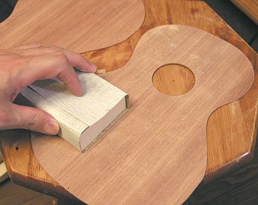 他にも書きたいことが山ほどありますが表面板だけで1つのコーナーになりそうなのでひとまずこれくらいにして、のちのち補足説明しましょう。サンディングの作業自体は退屈かもしれませんが#80とか#100のサンドペーパーは気が付けば「ありゃ?」というほど切削効果が高いので用心しましょう(経験者談)。ベルトサンダー杉山をお持ちの方は1〜2分削ってオシマイ......但し、サンディングの摩擦熱によって板が反ることがあります(この反りをムリヤリ逆に反るようにアーチのついたバーを接着するのです:私はそうしています)。