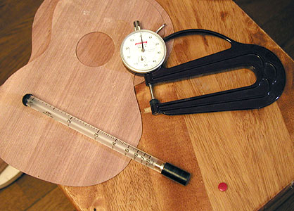 ・さっそく...というわけで部屋の片隅に置いてあるクマラエ2号の板の厚さを測ったところ、いちばん薄い箇所(部分的に厚さも同じでない)で約1.2mmしかありません (^_^)....。他のウクレレをあれこれ計ると、おおむね1.4mmとか1.8mmあたりが中心で、厚めのもので2mm程度のものもあるようです。今回のキットの表面板の厚さは約2.2mmでしたので厚い部類です(しかも手に取るとたしかに重い)。作業は最も手軽な方法は「紙ヤスリを角材に巻いてゴシゴシ法」でしょう。今回私は1.4mmまでサンディングしてみました。薄くしすぎるとタッピングしたときにブヨヨ〜〜ンと張りのない音になっちゃいます、私はその手前ぐらいでやめますが、削り過ぎたかな?というようなバヤイはアッパーブーツ(ボディの上部のこと)をバーやハーモニックプレートで締めてやることにしています(あえていえばこのへんがノウハウでしょうか)。ちなみに厚さはタッピングの音で決めることが多いわけでして緻密に厚さを測って均一にするわけではありません。測定器具を使って計るのは板の端部が薄く中心が厚く削られる傾向をチェックするのが目的なのです(私はそう考えてやってるのですが他の製作家は均一な厚さにする例もあります)。