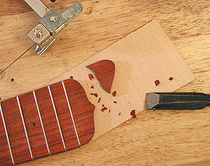 カマカ風?の指板は私は決して嫌いではないのですが、どちらかといえばマーチンスタイルも好みなんです。もしあなたが糸鋸をお持ちであればこうやって形状の変更もおもしろいでしょう。私はこういった箇所の細工にはジュエリー・ソウを使います。一般の工作用と違って刃がこまかいので時間はかかりますがきれいに仕上げることができます(これもミソ醤油)。