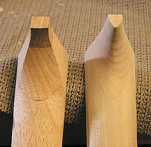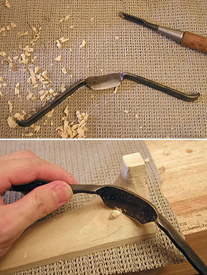 この作業はカッターでは困難ですから無理に行わなくともよろしいです。まったくの入門者の方はこの作業はお薦めしません.....。手短な工具で行うならノミを使ってグリグリと削っても良いでしょう、但し、ヒールのカドは鋭いですので手がすべってそのカドでひっかいて怪我をしないように注意してください(写真では撮影の都合上右手しか見えませんがクランプするなどしてしっかり固定し、左手はなるべく材料支持しないほうが安全です、もし左手で材料保持するなら軍手などを着用して慎重に作業しましょう)。この部分をノミで作業するのは危険なのです、むしろ小刀を使うほうが安全かもしれませんが左手の使い方は同様です。私はどうしたかって? こんな便利なモノがあるんですよ。ネックのある楽器の製作には必需品です(南京カンナでも可)。荒削りしたあとに#120程度のサンドペーパーでならせば御覧のとおり。