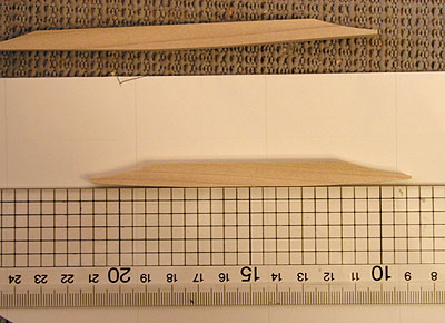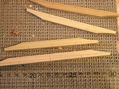で、結局のところ何をすれば良いのか? という話しですが、私は今回ちょっとだけアーチを付けました。最初にアーチの深さの目安のラインをエンピツで引きます。そしてカンナ(無ければみなさんはカッターと紙ヤスリでOKです)を使ってこんな感じに削りました。この写真において左から右へ順に........