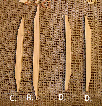 で、そのバーを削ってアーチを付けましょう。この作業はチョコレートのお菓子を食べながら作業するのが正しいのです、推奨は「ロッテ・コアラのアーチ」。まあ、一言でアーチを付けるといってもドームを付けるのとはちょっと意味が違う(似てるけど)わけでありまして、以下に簡単に図に示します(他にもありますが話が長くなるので今回は省略)。スプルースなどのバーを棒材で買ってきてまずは A. のように切り出しますね(木目のとりかたやその他注意点もたくさんあるけど今回はシンプルにまとめます)。キットにも A. の状態で準備されています。一般に「アーチ (arch) 」といえば半円を含めた弓なりの弧を意味するわけですが文字通り B. の形状が弓のカタチをしていることにお気付きでしょう。19世紀のギターにもこういったバーを用いた楽器がたくさんあります。また、ヴァイオリン系の楽器やGibson系に代表されるアーチトップギター&マンドリなどでは厚い板材からノミやカンナでコンモリと彫り出すことによって裏板や表面板に独特のふくらみが形成されるわけであります。本来はこういった彫り出しによるものをアーチトップとかアーチバックと称するのでしょう。が、現実にはバーを弓なりに削っておき、グイグイと板に押しつけて接着すれば B. とはまた異なるリッパなアーチが得られるのも事実であります。 B. と C. とではその楽器を一見すると似たようなふくらみに見えることもありますが木材にかかる緊張のメカニズムが全く異なるのです。