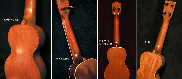 ハワイのウクレレの起源とされるヌネスや老舗のクマラエ、カマカなどのメーカは様々なスタイルのウクレレを製作していましたがネックとヒールについて注目してみましょう(次の写真のヒール部分に注目)。クマラエ(ヌネスもほぼ同じ)はヒールが大きくなだらかであるのに対して、T.BやMartinは一般にくびれがきつい細いヒールの形状であることが多いようです。以前、全音社ウクレレの担当の方とお会いして話をする機会がありましたが、そのとき、このヒール部分をきつく削ってやると音は良くなるという話をされてました。このことはキットの説明書にも書かれていますね。ちなみに私はクマラエを過去に何本か所有していましたがよく鳴る楽器もあまり鳴らない楽器もすべて太いヒールでありました..........。