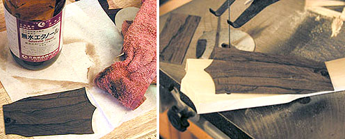 ヘッドプレートを付けます。手元にジリコテの端材がありますのでこれを使うことにしました。過去にギターの側面板に用いた部分で加熱して木の脂が出ていますから「油抜き」をやります。アイロンで加熱してやると脂が木の表面にしみ出しますから、それを雑巾にアルコール(エタノール)を含ませて脂を拭き取っていくのです。ローズウッドやココボロやジリコテなどは模様の美しい材としてギターにもよく使われますが脂がよく出るのでぜひとも油抜きは覚えておき、適切に処置しておきましょう。