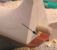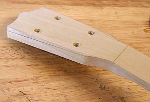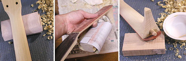ギターでもそうですが、先に指板をネックに接着するべきか、もしくはボディと接着した後に指板をネックに接着するべきか迷うところでしょう。皆さんはどちら? 私はどちらでもありません。じつは先に仮接着しておき、あとで分離してボディにネックをジョイントしてから再度接着します。つまりネックと指板の幅を合わせるために仮接着して指板とネックを一体化しておいてカンナとヤスリで成形するためなのです。面倒ですがこの方法でギターもその他の楽器も作ることにしています(私はこの方法が習慣になっちゃってるワケね)。