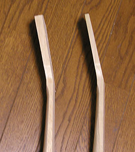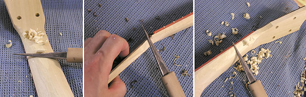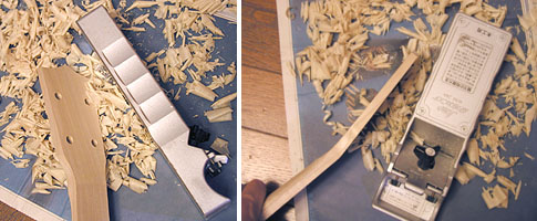 ここで「最適カンナ j-45」の登場です。今回はセッキョクテキにこのカンナを使っています。サクサクと良く切れますし、替え刃式なので切れなくなったら刃を研ぐ手間もなく交換しちゃうだけという手軽さ。はい、御覧のとおりあっというまにヘッドが薄くなりました。先端に向かって徐々に細く(薄く)なるように削ります。