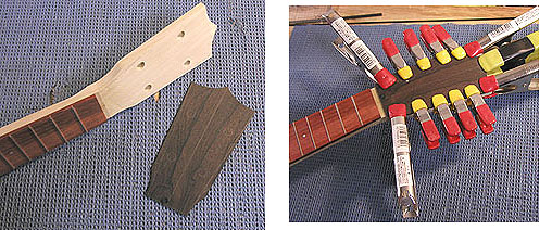 あとは接着するだけです。洗濯ばさみかクリップ式のクランプではさんで隙間が生じないようにしっかり圧着しましょう。乾いたらヘッド周辺のはみ出した接着剤などをきれいに整えておきます。