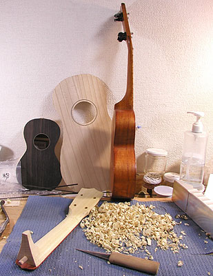 この写真のようにネックの断面形状など、現物を見ながら作業すればうまくいきますよ。 ん? 製作途中の楽器のいくつかが写真に写っていますが黒檀表面板のウクレレの姿がっ! ついに見た! 生きた化石イリオモテヤマネコ!?
