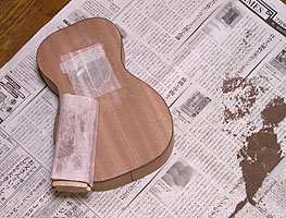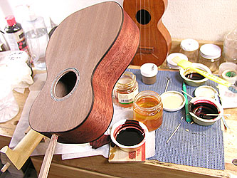 さあ、行きましょう。わたしゃ今までのウクレレはセラックでのナチュラル仕上げ塗装が主でしたが今回はひとつオリジナルカラーで迫ってみたいと思います。そうです、ここでみなさんのウクレレや「のみのみML」の連中に差を付けておけば浜辺では私の一人勝ちじゃ! ムフフフ.....。そういうワケで手元の顔料をいくつか組み合わせてオリジナルの色合いを調合します(セラックニスで溶かしてハケ塗りします)。顔料はヴァイオリン材料のお店などで入手できますがアルコール用とオイル用などがあるので選択には注意が必要です。塗装はヒストリカルな楽器の修理や製作ではじつにバリエーションの多い、深い世界なので今回は深く触れません(私もさほど詳しくないし)。