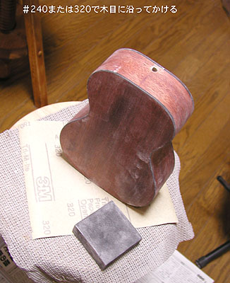 で、そんなかんだでラッカーを塗り.........のんびりしてたら写真を撮りそこねました。乾いたあとは次の写真のようにサンディングです。ここでは最初に240番あたりでゴシゴシやります。必ず木目に沿ってサンドペーパーを動かしますが照明をあてて塗装表面の状態をよく観察しながら作業するほうが良いでしょう。未乾燥の状態ではサンディングはシットリしてはかどりますが手にベタつき感が生じることもあります。完全に乾かしてサンディングすると今度はやたら堅くて大汗をかきながらの作業になります。ウクレレはボディサイズが小さいので比較的楽ではありますが......。