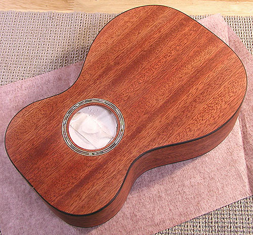 ちなみにこれが「染め」と「塗装」を行う前の色合いです。ヴィンテージ・ウクレレ風にオレンジ/アンバー系のセラックのみで仕上げることもあります(修理ではもっぱらそうしています)。