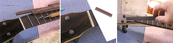 昔のウクレレのナットは 2mm 程度の薄いものが多いのですが今回は太いタイプにしてみました。象牙の端材で...と思ったのですが、あれこれ試してみたところ最終的には縞黒檀にしました。
