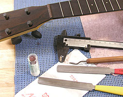 ナットに弦をはさんで支持するための溝を切ります。ナットフィルを使って写真のようにヘッド角度より少しきつい角度でゴシゴシやります。できればヘッドプレートにマスキングテープを貼って作業したほうが傷を付けなくて安全でしょう。ここをしっかりていねいに彫っておかないと演奏時のビリつき異音の原因になります。