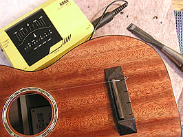 さあ! 弦を張って完成!.....と思いきや、ここでもやるべきコトがあります。今度は同じく弦を支持する役目でありながらボディの真ん中でどっしりと構えている「サドル」を加工せねばなりません。これも弦高、弦の張りの強さ、音色などに大きく影響します。今回サドルは象牙を準備していたのですがナットに合わせてローズウッドを採用しました。