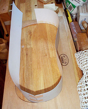 鉛筆で描いたボディの輪郭線がおわかりいただけますか? このようにやや外壁を高めにしておかないと型を成形する過程でボウル状に削っていく際にピークが低くなってしまいますので注意が必要です。つまりボディ中央部の盛り上がった部分よりも外壁は高くなければなりません。ボール紙の外壁は合板フレームに紙テープで固定します。このとき上下のブロックの位置も決めて紙テープで固定しておきましょう。
