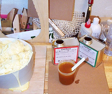 この製品は主剤と硬化剤の2液を付属のカップで同量を混合し、素早くかき回して型に流し込むと約3分で硬化します。恐ろしく短時間で固まるのです。その間膨張と発熱(約摂氏100度とあるが実際には50度前後)を伴うため外壁がヤワだとゆがみを生じるのであります...。
