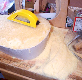 サンディング・クロウでバリバリと削ってボウルバックを成形していきます。このときボール紙のけがき線を目安に(ほんとに目安程度なんですよ)丁寧に削っていきます。削りすぎてもまたレジンを盛ることはできますが私は1回で仕上げました。かなりの量の削りカスが発生します。これは不燃物ゴミですね。