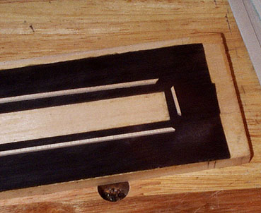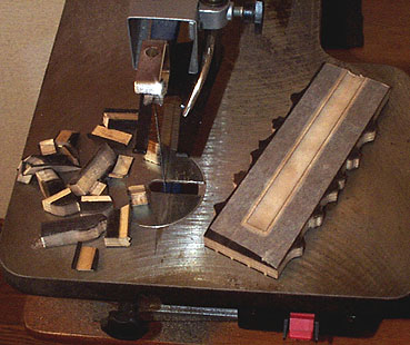 メイプルの細棒を接着後、さらに黒檀の細板を接着します。この黒檀の細板は一枚板から糸鋸を使って、さきのメイプルのスペーサと同様に切り出したものですが、厚さはわずか 0.2mm しかありません。難しくてちょっと切り出しに時間がかかりましたが均等に0.2mm厚です。