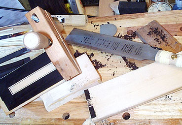 たいていのバロックギターのヘッドは三角ほぞで継ぎますのでネック側とヘッドプレート側を合わせ、ノミで加工していきます。ここにリブ材として使った黒檀の帯板を張り合わせていくのです。