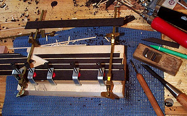 ここではネック側の帯板とスペーサとが延長されるように幅を調整しながらの作業となります。ミニチュアのクランパと籏ガネが活躍しています。比較的容易な作業ですのでのんびりやります.........Zzzzz......。