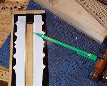 というわけで、ヘッドのシェイプを決めていきます。図面のテンプレートをもとにその輪郭を鉛筆でなぞってヘッドにマークします。これを糸鋸で切り出すわけです。