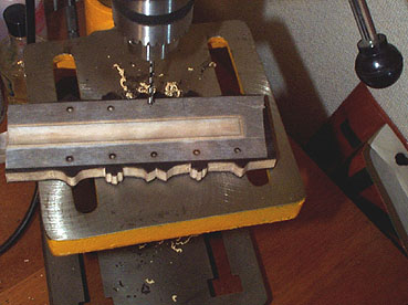 というわけで、久しぶりに電動工具を使いましょう。卓上ボール盤でございます。直径 3mm の木材用ショートビットで仮穴を開けます。裏まで貫通させると割れを生じやすいのでビットの先端がわずかに裏に出たところで止めます。最近は先端がスクリューでなく三角の「三角ショートビット」があって、作業中にめり込んでいかずたいそう使い安いのだそうです。そろそろ私も買おうと思っています、スターエムさんのホームページをご覧あれ。