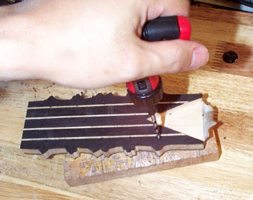 おおまかに糸鋸で切り出したら次はペグ穴を開けるためにキリで目印を付けておきます。考えてみると私は糸鋸盤以外はほとんど電動工具を使っていないことに気付きます......。
