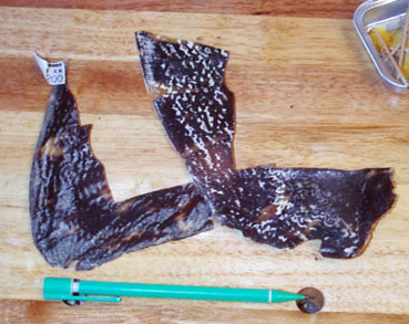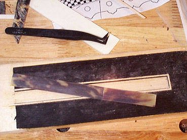 このベッコウは東急ハンズで入手したものですが端材とはいえ、かなりの値段です。しかもサイズや厚さはまちまちですから用途に応じて寸法を測り、カットしたうえ、厚さを削って揃えてから使います。今回は細長い長方形ですが、長さが足りませんので2本使って継ぐことにしました。カメさんには申し訳ないけど「カメは死んでも甲羅を残す」ということで後の世まで私のギターにつきあってもらいましょう。