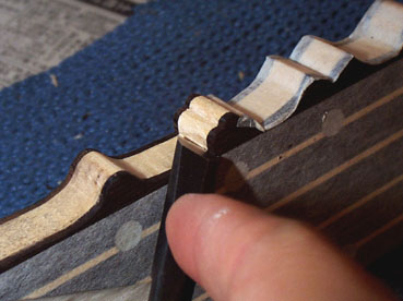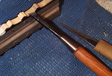 あとは装飾するための浅くて長細い溝のフチをノミでならしておきます。ついでにネックとのジョイントを仮組みして確認....。