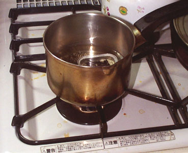 カットが終わったら鍋に水を入れてロゼッタを小さなケースに納めて煮沸します。私はジャムやチーズのアルミケースを使います。時間をかけてゆっくりニカワを溶かします。すると自然に黒檀のヒゲ飾りは2枚に剥離しますが、無理に剥がそうとすると、これまたポキポキいきますのであせらずのんびり栗アイスでも食べながら待ちましょう............Zzzzzzzzz.........。