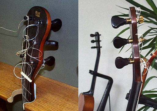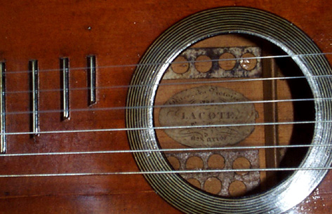 それから指板(フィンガーボード)ですが、ラコートは大別してリュートのように表面板が10フレットあたりまで伸びていて指板と同一面にあるもの(フラッシュボード・タイプ)と現代のギターのように指板がサウンドホール付近にまで伸びているものとがあります。以下の2つのでっかい写真を御覧あれ!
