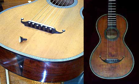 あとはブリッジの素材と形状などについて考えてみましょう。おおむね黒檀が広く使われているようですがたいていはモダンなクラシックギターと比較してコンパクトというか小ぶりです。サドルも下左の写真を見る限りでは高めの設定カモ。エンドピンはもちろん装脱着可能に。貝の装飾(ブリッジのボタン)については白蝶貝かマザーオブパールでいいでしょう。